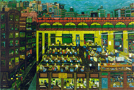 我喜欢这个画家,叫Ralph Fasanella,意大利裔美国人。伯格说他的画表达了城市生活的四重法则: