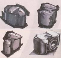 第一阶段:首先要在纸上乱画一气,画到漂亮好看,大伙都同意为止。这个阶段的学名是“构思”,也就是Imagination。涂鸦谁都会,但大师的涂鸦就跟俺凡人的不一样,否则谁都可以做Giugiaro(意大利设计师,NIKON F4的外型就是这家伙整出来的)了。Z-1的早期大师涂鸦见图1,有没有现在Z-1的影子?