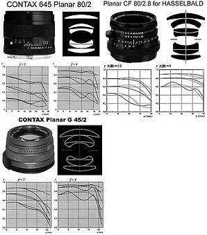 645 6X4.5 SLR,光学结构为6片/5组;CONTAX Planar G 45/2则是用于CONTAX G系列旁轴照相机,光学结构为6片/4组。