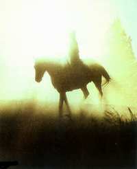强烈的逆光实际上使你无法准确测光。光线很美,由于扬起的细微灰尘而形成散射光,人物变得像幽灵似的。当使用入射式测光表对所拍摄的景物测光时,只有让同一光线落在入射式测光表上,它才奏效。因此,逆光拍摄不能使用入射式测光表。我还担心若直接按测取的曝光读数拍会使骑马人的影像成为黑色剪影。
