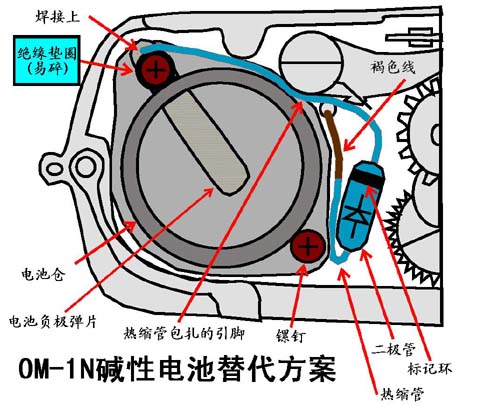 经典的东西都不是人民群众喜欢的或者能用的东西. 很多老相机满足器材发烧的标准----结实耐用, 性能可靠, 全金属, 象MINOLTA的SRT, CANON的FTB, OLYMPUS的OM-1, NIKON的FTN等. 先说俺手上这台OM-1N吧, 外观很好, 问题一堆. 先说个有代表的: 测光与电池问题. 一 OM-1N的TTL测光设计用的是1.35V的汞电池EPX625或PX625. 先不说它怪异的草帽形状, 这种形状的电池很难找, 但毕竟还能找到. 可现在能找到的也是A625碱性之类电池, 因为毒害人民群众生活环境的汞电池早已禁止生产了. 这种A625碱性电池的标称电压是1.5V, 小电流负载时1.6V了呢. 装上代用电池, 测光, 呵呵, 挺准的嘛, 俺在室内. 俺这室内的光线条件用什么EV, 俺早知道. 过些天, 中午, 准备用它, 对着窗外, 测光, 咦怎么回事? f/16, 1/1000s? 晕倒~~~, 按阳光16法, 也该是1/100s的, 它起码欠了3档 早就知道老机器的电池电压影响测光, 但也不该这么离谱吧? 前些天在室内测还差不多呢! 看看, 俺在不同光照条件, 再对比测测: EV2: f/2, 1s 测光正常 EV6: f/5.6, 1/2s 本机约 -2/3 STOP EV9: f/5.6, 1/15s 本机约 -1 STOP EV16: f/8, 1/1000s 本机约 -2.5 STOP 测量一下电池电压: 1.558 V 真是过分! 不比不知道, 一比吓一跳, 难怪这机器前主人说它测光不准, 感情是这么回事, 阳光下欠3档, 还照什么片呢. 俺想起俺那SRT中还有一颗电池用了很久了, 赶紧取过来试试吧. 测量开路电压1.443V, 估计装进机器后电压会降一些, 先装进去再说: EV2: 正常 EV6: 正常 EV9: 约-1/2 STOP EV16: 约-2/3 STOP 这个结果比较满意, 看来, 电池是罪魁. 以前有人碰到这种情况, 多是不管, 俺的SRT就没管过这问题, 印象中测光误差没这么大. 也有人把A625放电, 放至1.4V再装进去. 但碱性电池内阻就不大, 等电压放下来, 电力消耗也差不多了, 这种方法不可取. 现在的问题是想办法把供给测光电路的实际电压降下来, 考虑俺自己研习十数载电机工程, 这个问题嘛, 自己心里还是有底的. 打摩一下看看吧. 二 先把机器翻过来, 看看底部, 电池从底部安装的, 仓盖与电池正极相接, 与底盖无绝缘, 也就是说, 正极是电路的COM端, 电工上也叫"地". 底部四颗镙钉, 一目了然, 用改锥轻轻卸下上图中标记这红色的4颗镙钉, 经典的OM-1N就露出了它精美做工的内脏. 内部LAYOUT不太宽松, 比起同时代的机器, OM-1N显得要更小巧, 所以内部紧凑也是当然之事. 顺着上图揭开底盖往里看, 左右两边略宽敞一些, 中间, 特别是脚架安装孔边上机关甚多, 左边可以看到4个齿轮(轴), 上边是快门释杆(俺不说你都能想到, 外接马达就是拨动这根杆释放快门的), 下边则是快门上弦杆. 现在再说说右边, 快门操纵杆连动两个行程开关, 其中醒目的一个(常闭)引出到底盖外, 给个接马达用的, 另一个则隐藏在它的上方, 它在快门打开后闭合, 引出两条线, 这两条线应该到了顶部去了, 那里还有一个外接可选的闪灯热靴呢. 前不久, 有大侠介绍说, 如果这机器(OM-1N)闪光不灵, 不用开膛剥肚, 打开底盖就可以修, 指的就是这里. 看到这些机构, 想想为什么这机器的底盖做的这么结实和精致了, 这不是今天的国内外机器能比的, 这也许是它经典的表现之一吧. 废话说了一堆, 言归正传, 看看电池仓及接线吧. 前面提到, 电池正极是公共端, 没办法了. 负极是"电源"端, 看看电池仓周围, 真不算宽敞, 如果你打开过SRT的话. 还好, 也不是一点缝隙都没有, 插入几个电子元件还有可以的. 下面想想方案了. 先分析测光的误差问题. 从前面的数据看到, 误差随光照EV值呈非线性增加, 这种非线性是什么规律呢? 先把负极引线(褐色)断开, 再接入电流表, 看看不同光照下电池电流消耗情况. EV2: 0.0148mA EV6: 0.0703mA EV9: 0.1632mA EV16: 0.4835mA 嗯~~~, 电流越大时, 误差也越大. 这就是说当电流大时, 应该把电压降低些, 电流小时, 误差小少降多降一点没关系. 最大误差时, 降低电压幅值应该是0.15V~0.20V之间. 降电压最简单的方法就是串入电阻了. 说干就干, 先计算一下, 以0.500mA降0.20V为校正点, 算得应串电阻大小是400欧, 离这个值最近的标准标称值是390欧姆, 可惜手上没有, 只有470的, 用上再说吧. 3分钟之后, 飞线完成, 实测一下, 对着阳光, 测得实际供电电压为1.36V, 哈哈哈~~~, 大功告成. 再测量其它光照条件下的误差: EV2: 基本无误差 EV6: 约 -1.0 档 EV9: 约 -0.5 档 EV16: 基本无误差 TNND, 忘了数学逼近, 电阻是线性的, 误差是非线性的, 两头校准, 中间误差还在. 如果把电阻调小(譬如330欧), 那可能使得各种光线下误差在0.5档以内. 这对拍负片没什么影响的. 到目前为止, 打摩可以告一段落.每台机器的测光元件不一致, 误差时电流可能与俺这台不一致, 总之, 串一只300~390的电阻估计问题就能解决到相当不错的程度, 3.0STOP VS 0.5STOP嘛, 进步还是很大的. 最后按上图中处理就行了. 图中二极管就是电阻位置. 至于二极管嘛, 呵呵, 后面还有的说, 那是进一步的方案了. 三 一台经典的机器, 你能容忍它的0.5档测光误差吗? 俺不能. 俺还要进一步寻找打摩方案. 要消除各种光照条件下的误差, 首先得作一些误差特征的简单分析. 假定测光元件是线性的(其实略有些非线性, 它通过桥路平衡补偿了), 而对感光特性却是平方律的, 正因为如此, 前面电阻(一阶)逼近补偿会造成较大剩余误差. 若能找到近似传输特性的非线性器件进行补偿则是最好的. 这里, 很容易想到, 过去微型收音机里用的检波管2AP9, 这种小