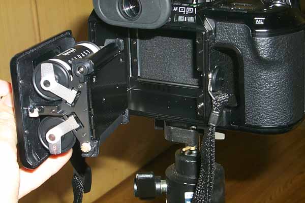 侧面装上了快装板以后, 相机就可以非常平稳的放在云台上了, 这个设计虽然是很容易做到,实现的. 但也只有pentax 645这么做了, 或许这就是真正的"以人为本"的设计, 因为这个设计, 我一下子,对pentax亲近了许多. 因为向我以拍摄人像为主, 所以决大多数照片都是竖构图的, 除非是镜头上带3角架的支撑, 否则象f5这么笨重的135相机,要想固定在云台上,非常的吃力.