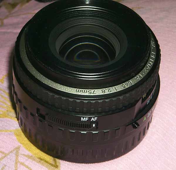 先来看 75/2.8镜头,这个镜头是比较老的设计了, 对焦的时候镜头前后还是伸缩的. 但前组镜片并不旋转,所以不影响使用偏振镜. 此镜头的af/mf切换是类似nikon镜头的设计,在使用的时候需要 拨动af/mf开关,比较麻烦.