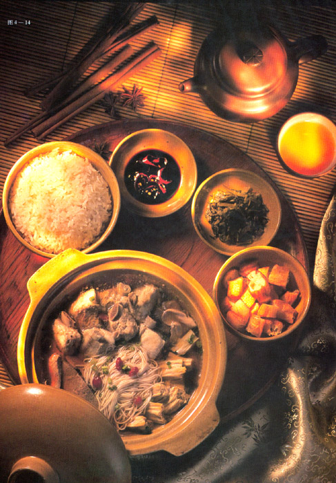 用光一般需要一支正面的硬光做主光突出食品色彩的鲜艳,然后根据需要用柔光做逆光,特别能表现热气和通透的菜叶等元素。然后注意营造几个高光,(可以在餐碟以及油脂的部位)顶部如果再加一支柔光可以减少阴影的影响。如果没有条件用柔光箱可以用柔光伞代替,没有专用影室灯可用立灯加大功率灯泡代替。(不过要注意色温,配合雷登镜使用,并避免使用rvp等对色温敏感的胶片,建议使用400度的胶片,这类胶片虽然颗粒较粗但考虑到室内使用对色温不太敏感,适合无须出大幅面印刷使用的照片。)拍摄时对于餐盘周围的摆设十分讲究,要配合菜肴的色彩、品位,但又不能抢去菜的亮点。如果要在后期做去底的工作,那在拍摄前期一张单色的背景纸是必须的。