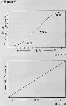 在这个曲线的趾部曝光量每有增加,只使密度略有增加,‘到达肩部以后,曝光量每有增加并不使密度按比例的增加。只有在趾部与肩部之间,曲线的直线段落,每当曝光量有一些增加时,密度总是随着按比例的增加。