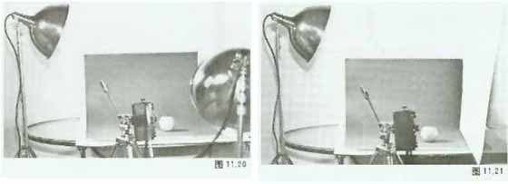请看图11.17。这幅照片的问题在于,苹果本身的阴影区太暗,我们无法看到阴影的细节。虽然我们想利用阴影展示苹果的外形,但并不想把它的表层隐藏起来。在苹果的暗处有一个蛀洞,这是大家有目共睹的。为了让阴暗面"突显"出来,我们可以在阴影一侧添加一盏小型灯。方法有两个:把1盏辅助灯放在相机旁边,如图11.19所示;或者在右侧放置1个反光板,目的是将来自主灯的光线反射到苹果的右铡,如图11.21所示。