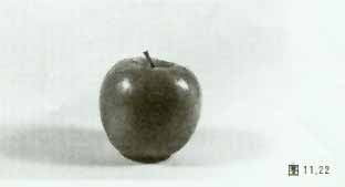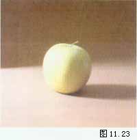 至此,你应该能像图11.20所示的那样把主灯和辅助灯组合起来,或者如图11.21所示,利用主灯和反光板的组合进行满意的布光了。接下来,我们再做一次最后的调整,目的是让照片看上去更接近专业水平。如图11.23,请留意我们是如何使背景中出现一条阴影线的。照片因这条位于苹果后面的"地平线"而大为增色,而且操作起来并不难。当你已经用辅助灯或反光板取得了你想要的精确布光后,建议你再一次回到主灯前,缓缓地向下转动灯具,同时仔细观察苹果受光变化。你会发现,当灯转到某一点时,无缝背景上便出现主灯上端边缘的影子。这时,继续向下转动灯,直到你从取景器中看到这个影子已落到苹果后面。这样,灯具的位置便确定下来了。这时,苹果的各个侧面都受到光的照射,但背景却处于阴影之中。我们把这种布光法称为"羽化"光线,它是专业拍摄技巧储备中的一个很有价值的工具。